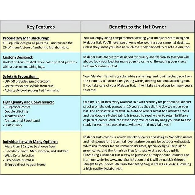 - Malabar Hat Co. Straw Hats With Printed Pattern Underbrim Keeps You Cool and Protected From Sun Damage.