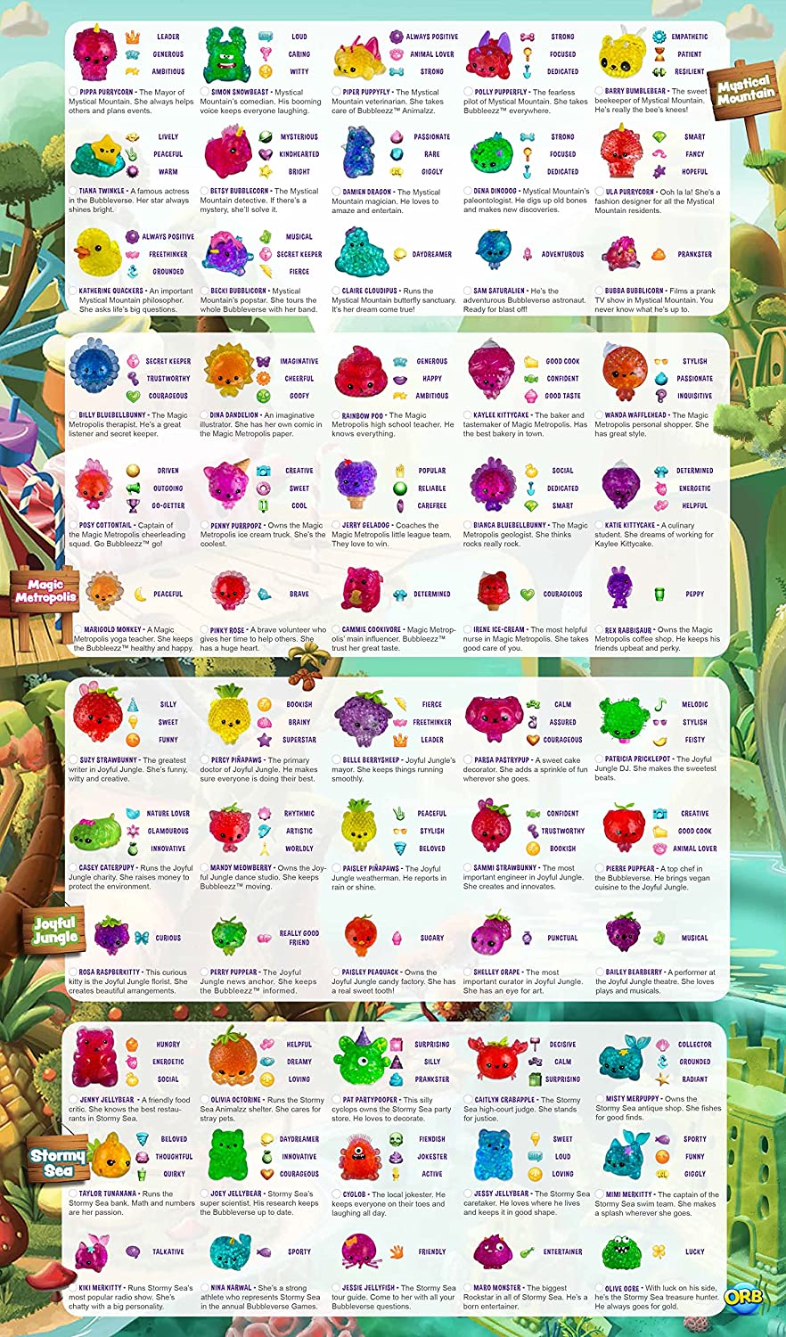 Bubbleezz live in a squeezy world of wonder and fun called the Bubbleverse. Each Bubbleezz contain charms and secret messages that are clues to their unique personalities. These cute character combos are full of surprise and come in hundreds of shapes and sizes.