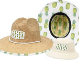 • wide-brim adult straw lifeguard hat with a colorful printed underbrim and matching patch — perfect for beach lounging, fishing, or gardening.